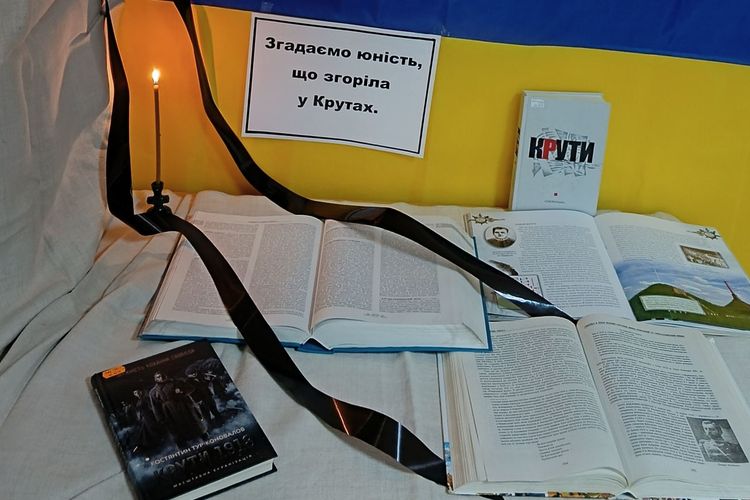 У бібліотеці Погребищенського медичного фахового коледжу влаштована книжкова виставка, яка розповідає про героїчний подвиг київських студентів під Крутами.